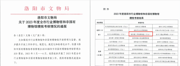 近日,洛阳市文物局发布了《关于2023年度全市行业博物馆和非国有博物馆绩效考核情况的通报》,经过博物馆自评、县区考评机构初核、市文物局组织专家组开展实地考核等环节,美高梅娱乐场