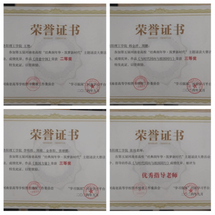 图书馆积极响应,精心组织,荣获优秀组织奖荣誉称号。其中教师组王艳老师作品《诗意中国》荣获二等奖;李明伟、周萌、金春阳、张继鹏老师作品《强国力量》荣获三等奖。本科学生组韩金洋、周鹏同学的作品《与时代同向与祖国同行》荣获三等奖。