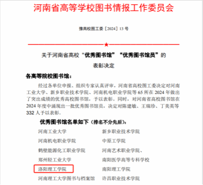图书情报工作委员会组织,每年评审一次,旨在充分展示河南省高校图书馆和广大馆员的良好形象,发挥先进典型示范引领作用。2024年我省共有65所高校图馆荣获“优秀图书馆”称号,332名馆员荣获“优秀馆员”称号。