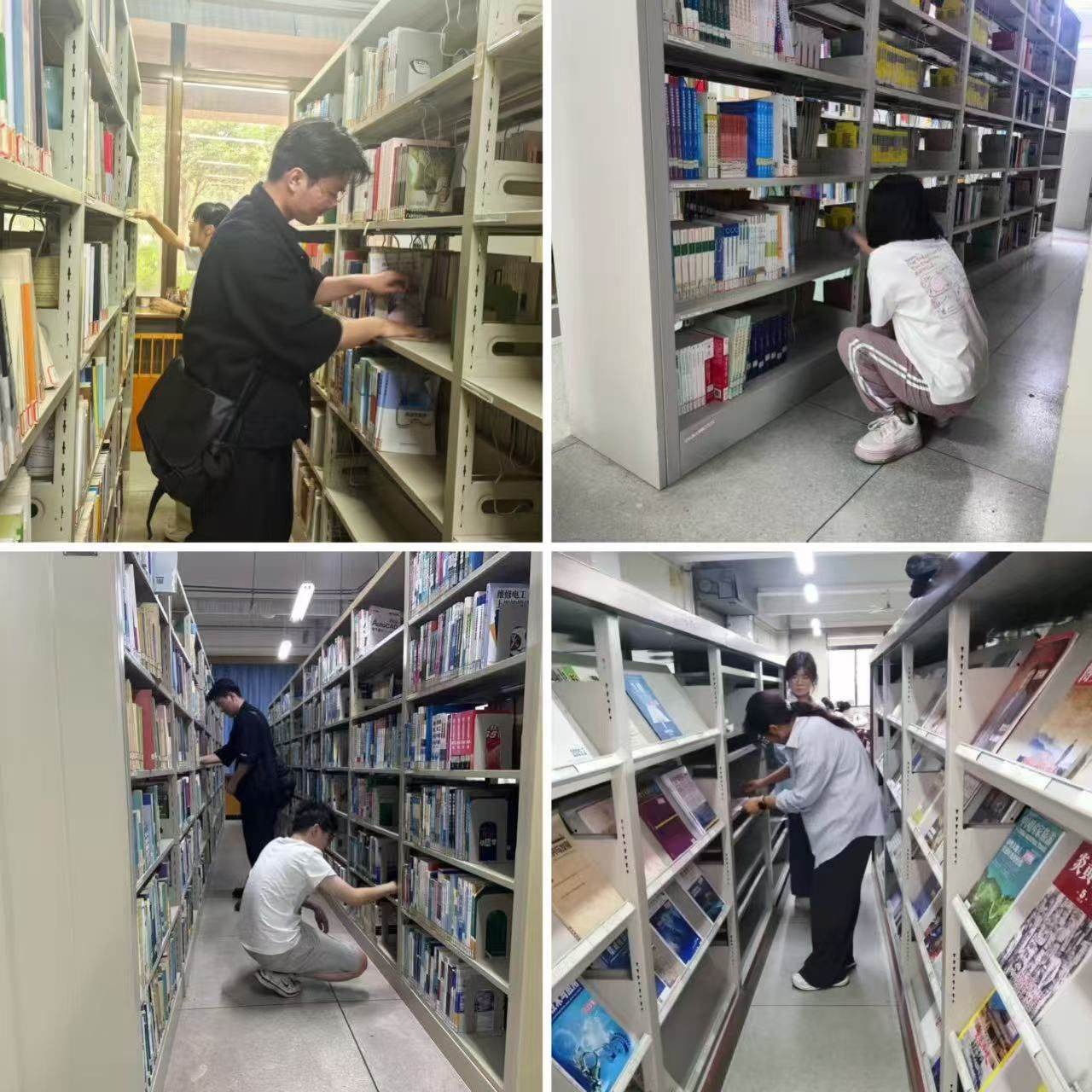 活动当天下午,志愿者们早早便汇聚在图书馆大厅。在图书馆老师的指导下,他们迅速明确分工,投身到紧张有序的工作之中。大家手持抹布等清洁工具,化身“书架美容师”,对每一层书架隔板进行细致入微的擦拭,不放过任何一处积灰和杂物。经过两个小时的辛勤劳作,书架焕然一新,各类书籍在志愿者们的精心整理下排列得更加整齐有序,图书馆的整体环境也变得更加整洁明亮,弥漫着清新的书香气息。
