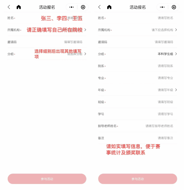 2.按照活动界面要求,填写姓名、所属机构、分组等真实的报名信息,团队参赛的师生请将团队所有成员姓名填写完整,并用“顿号”隔开;图书馆邀请码为903494,校内师生也可自行申请个人邀请码,邀请人数达标可获“推广星锐奖”。(注:报名信息仅用于赛事统计及后续颁奖联系,请放心填写);