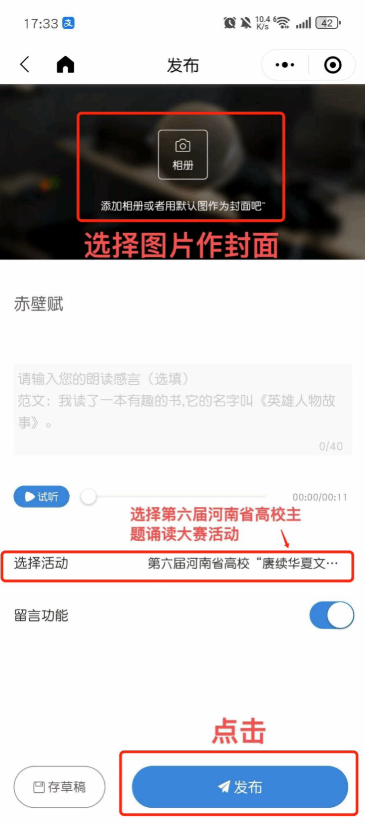 4. 诵读完成后,点击“完成”,点击相册添加喜欢的图片或使用默认图做封面,在“选择活动”处确认提交至“第六届河南省高校‘赓续华夏文脉·唱响时代新篇’主题诵读大赛活动”,点击“发布”,即作品提交参赛成功。