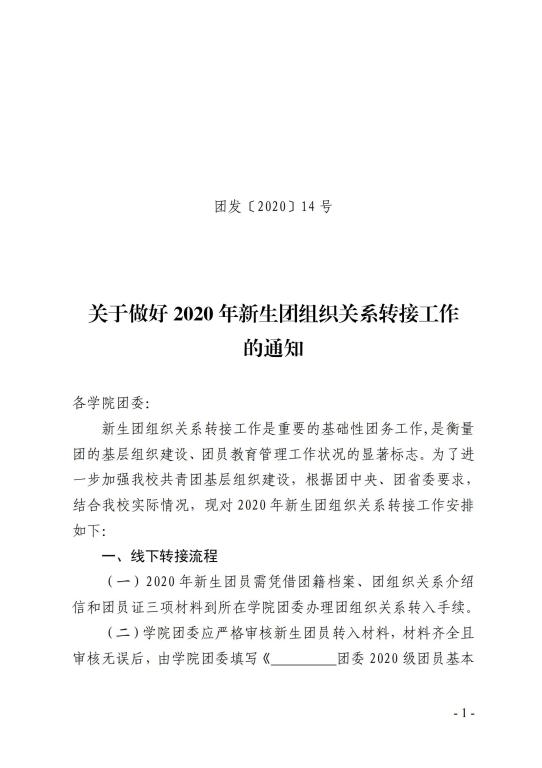 团发〔2020〕14号关于办理2020级新生团组织关系转接手续的通知