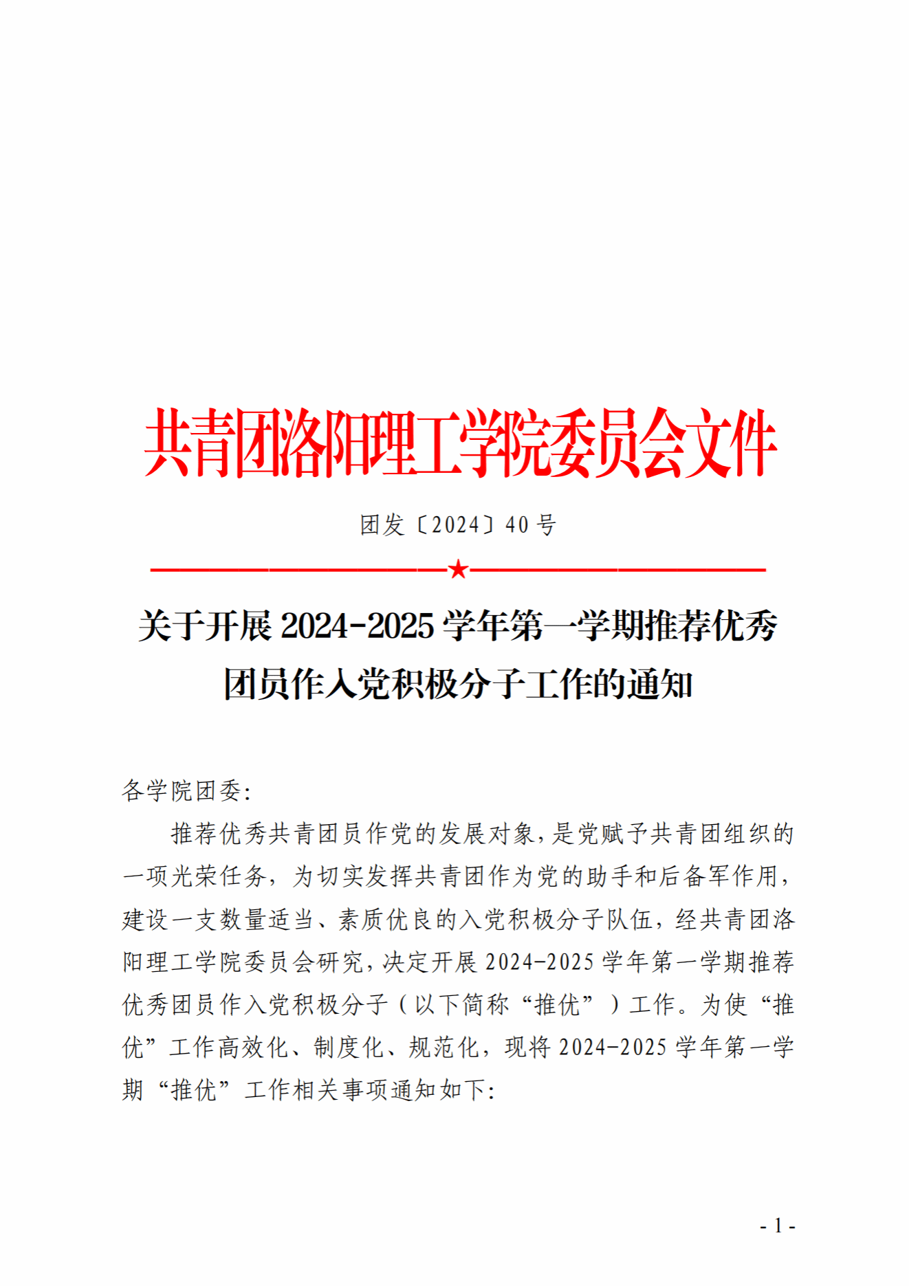 关于开展2024-2025学年第一学期推荐优秀团员作入党积极分子工作的通知