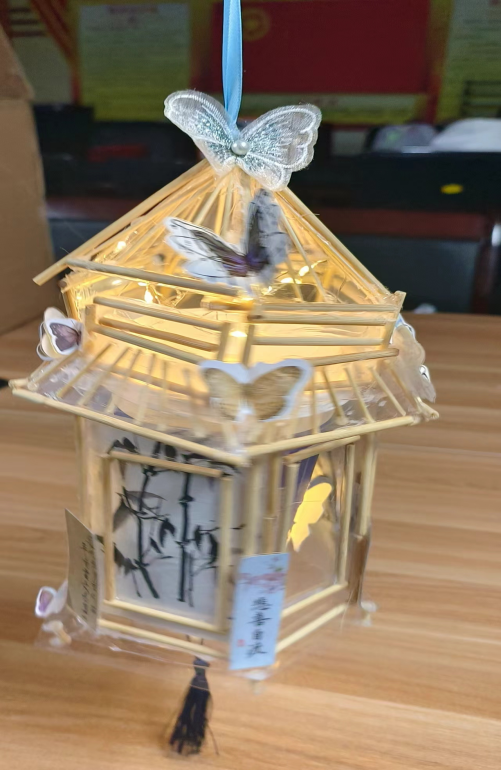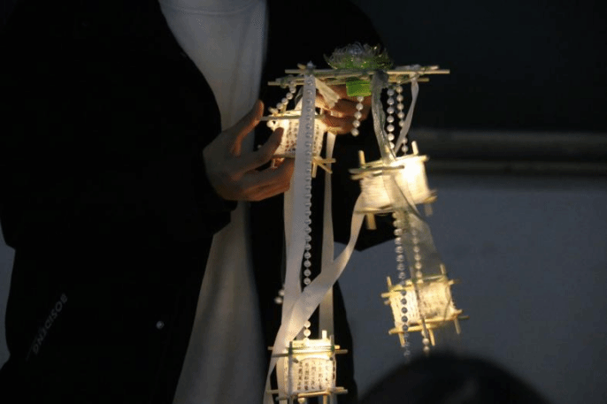 该作品主要由海棠花玻璃贴纸、竹签、牙签、一次性筷子制作而成,奶茶杯做成灯笼,实现了废物再利用。灯光的渲染,无不将人们沦陷在中国特有的美之中。