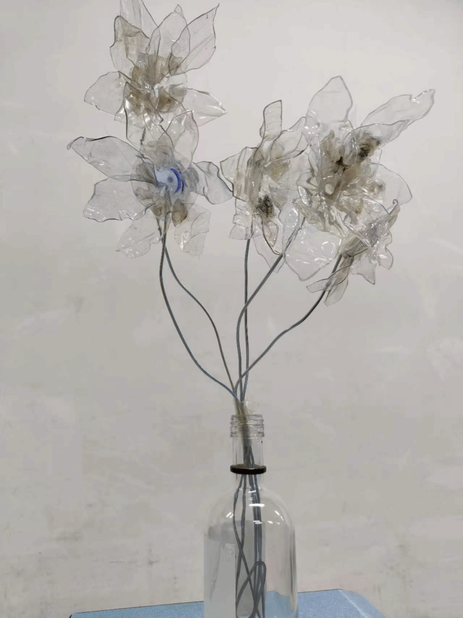 作品展示了废弃塑料瓶的独特利用方式,将废弃塑料瓶剪成花瓣状,然后粘贴成花状,最后粘贴在废弃铁丝上,可以达到美观装饰的用途。