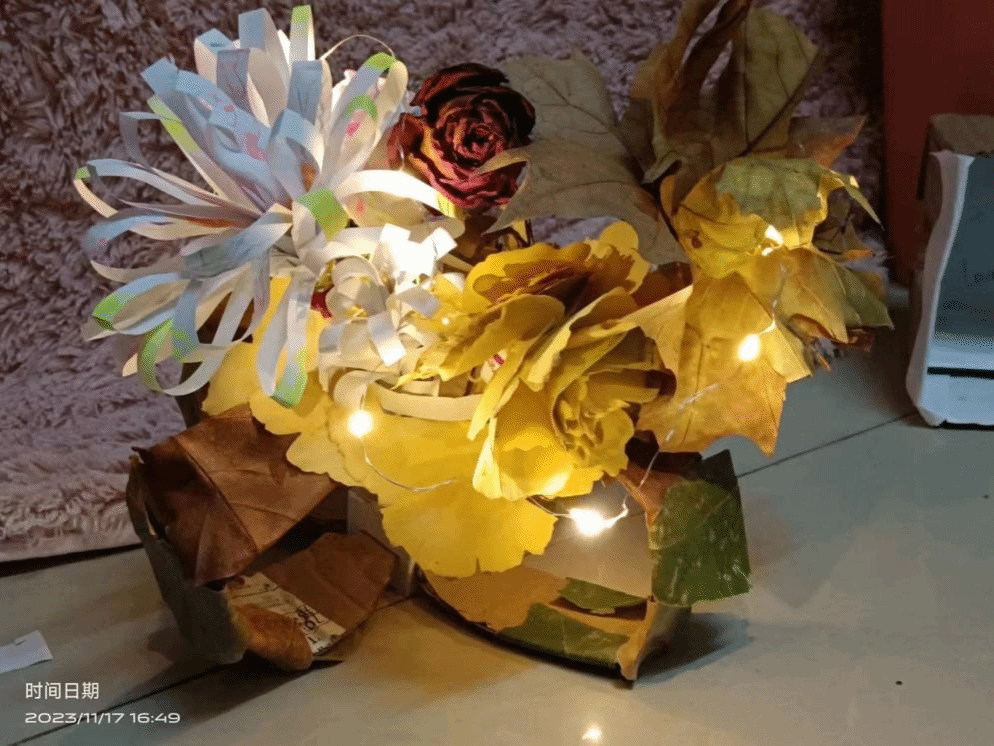 作品采用树叶、废弃纸箱等材料。指尖是灵魂创作的起点,我们把生命赞颂为歌,勤劳的双手曼妙如舞,我们把春天留不住的美丽,守护在心田,在灵动的指尖下诞生了属于四季的花朵,盛放的美丽是花的年华,是指尖的辛勤,是灵魂永生的趣味。