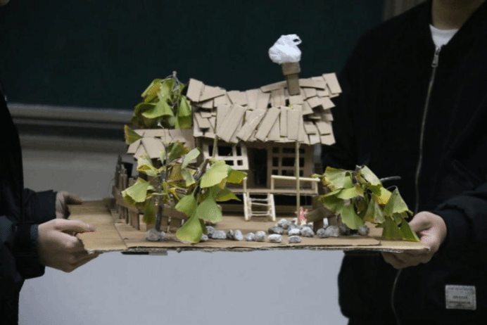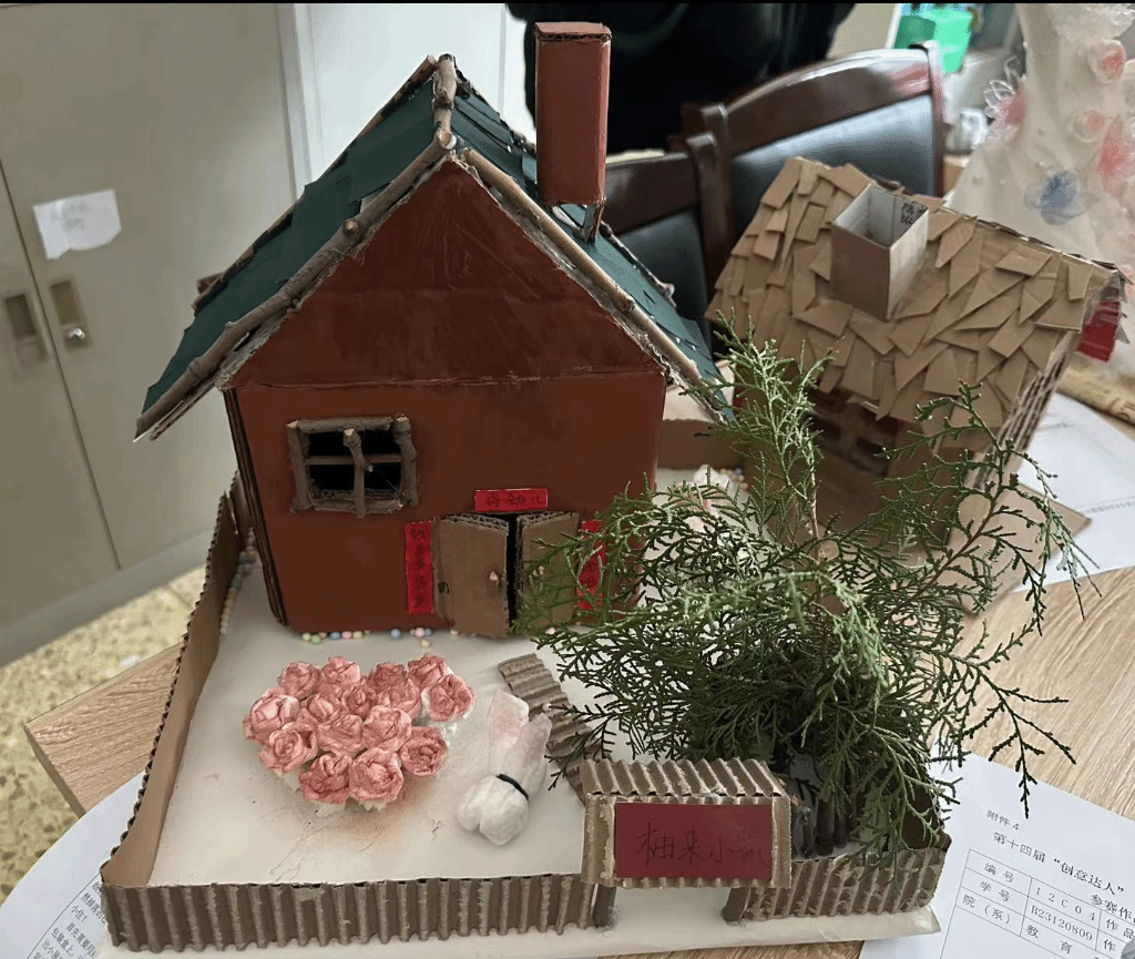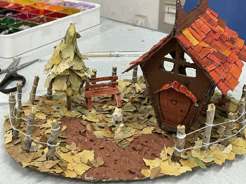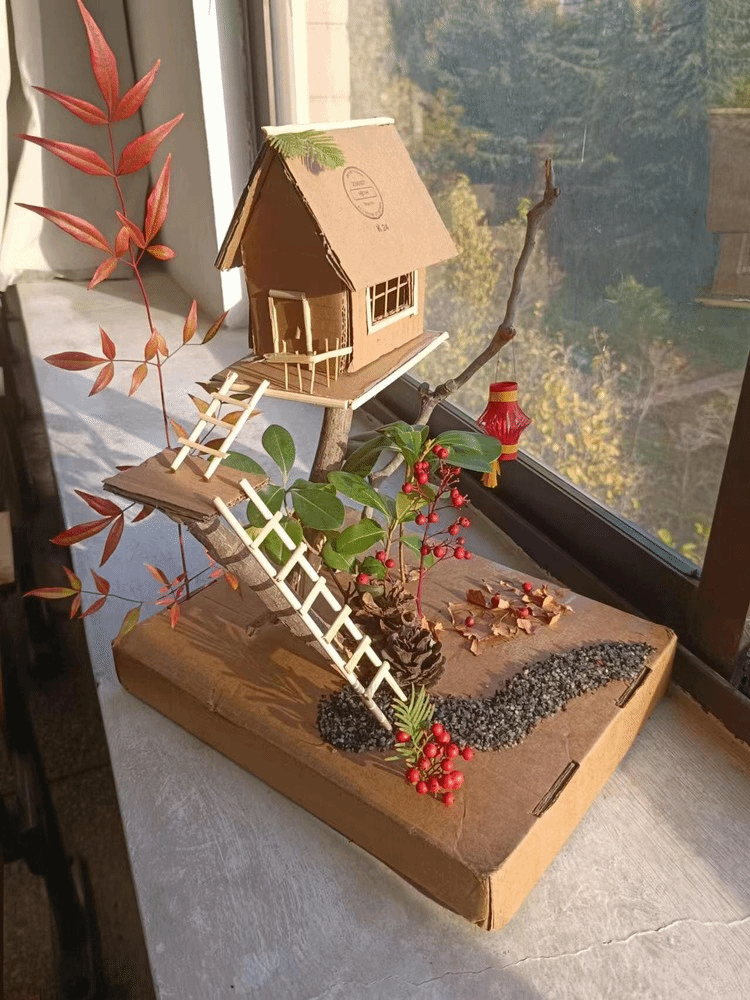 这是一座由纸箱和树枝构成的迷你房屋,它坐落在一个木制平台上,由绿叶衬托房屋。房屋的设计非常精细,屋顶上覆盖着绿色的叶子,墙壁上挂着一些小装饰品。整个作品给人一种自然、温馨的感觉,仿佛是一个小小的童话世界。