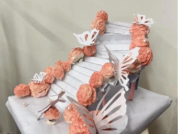 作品主要采用卫生纸、A4纸、快递箱等废纸制成。A4纸、快递箱做成阶梯,废卫生纸做成蝴蝶和花,在平淡的冬日寝室里,平添了一份美好。寓意着在人生的道路上到处充满精彩和美好,只要你拥有一双发现“美”的眼睛。