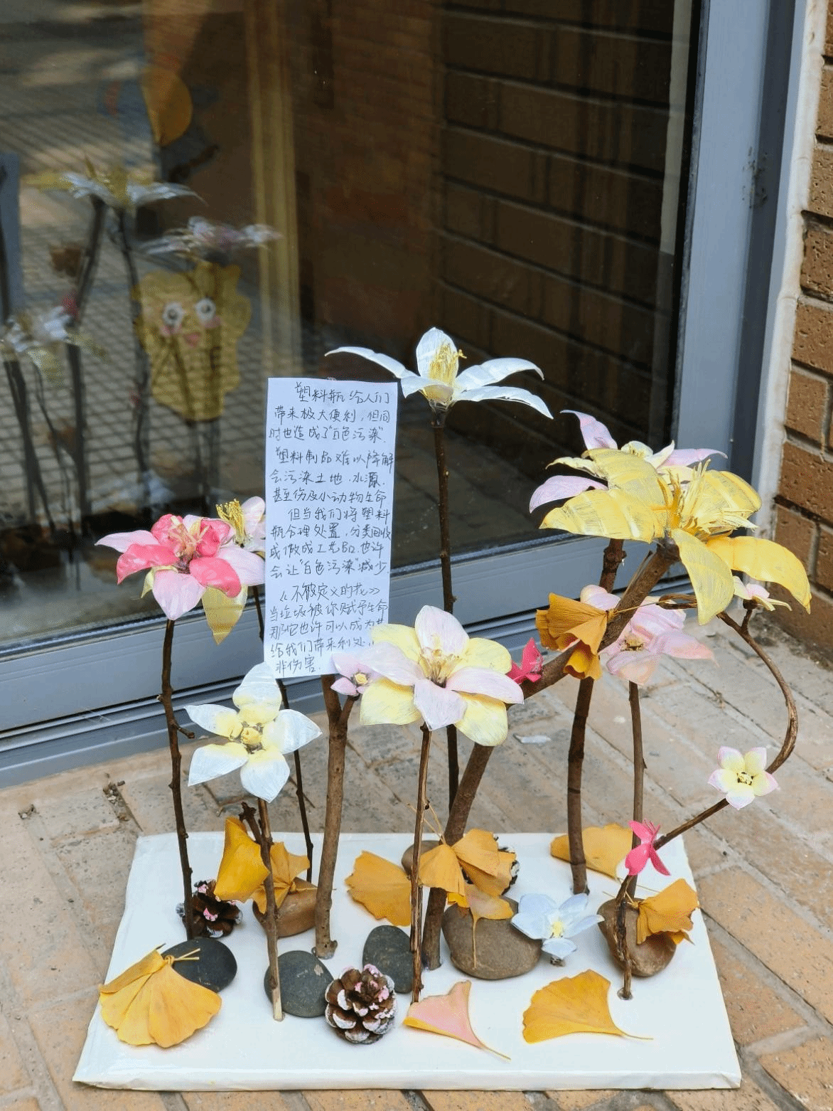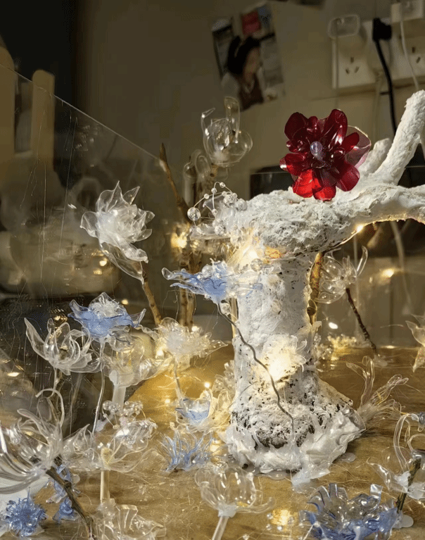 作品是将塑料瓶剪成花瓣和蝴蝶的形状,用火烧出弧形,组合在一起。保护环境,减少白色污染,合理处理塑料垃圾,让我们的生活处处充满不被定义的花。