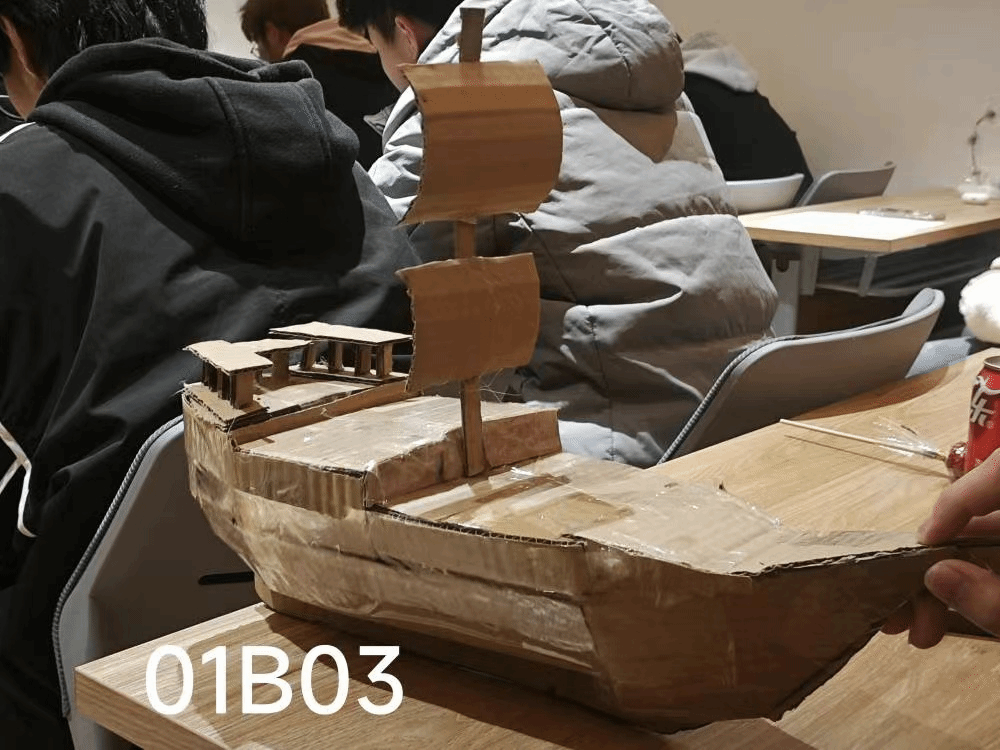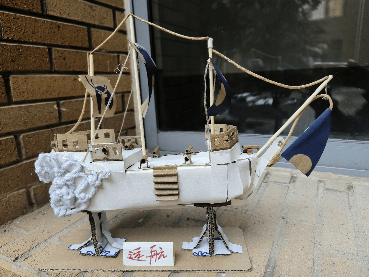 作品将常见的废品拼接和粘贴为船模,帆船代表着年轻人对未来的向往和拼搏精神。帆船在海洋上大风大浪变幻莫测的环境下生存并前进,寓意着一个人不受困难阻碍,去奋斗、拼搏,象征执着和勇气。