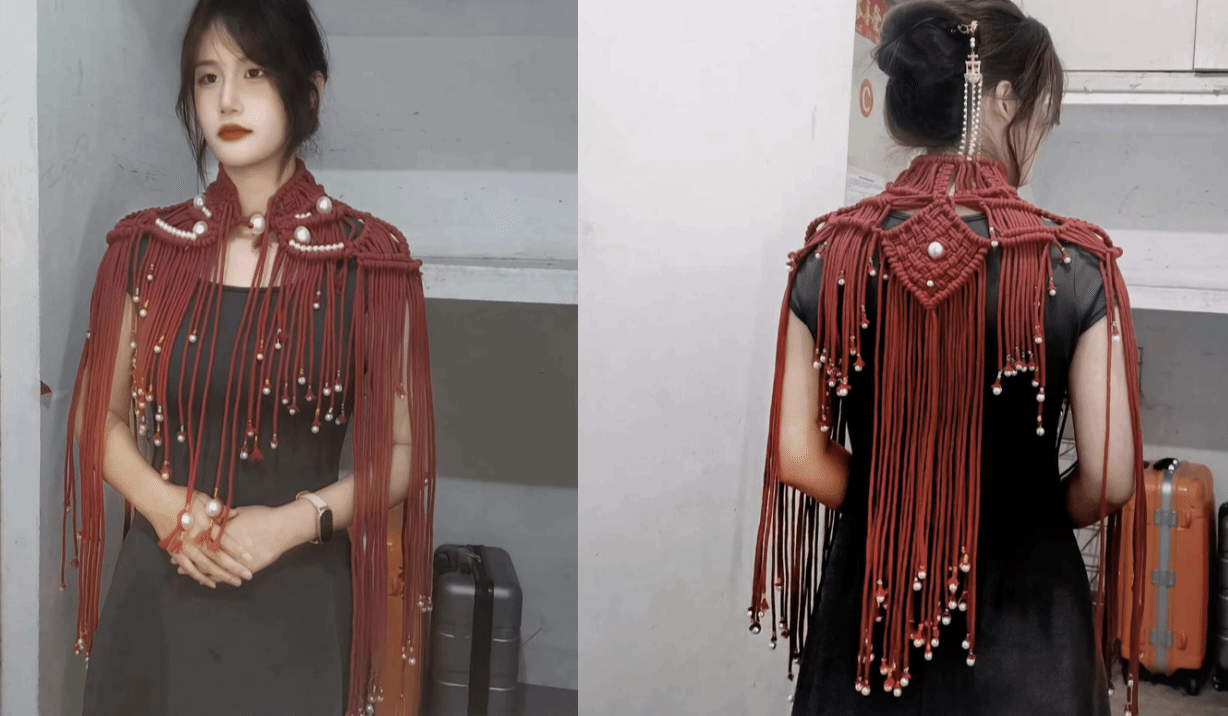该作品由百米长绳裁剪为众多绳段,一根一根绕至成型,每一个结,每一颗珍珠,都由作者亲手融入作品中,裁剪的过程中剪断每一根绳子意味着剪去三千烦恼丝。同时编制的过程是治愈人心的,不同于当今快节奏时代的焦躁不安,在繁杂生活中,维持一分安静与祥和。