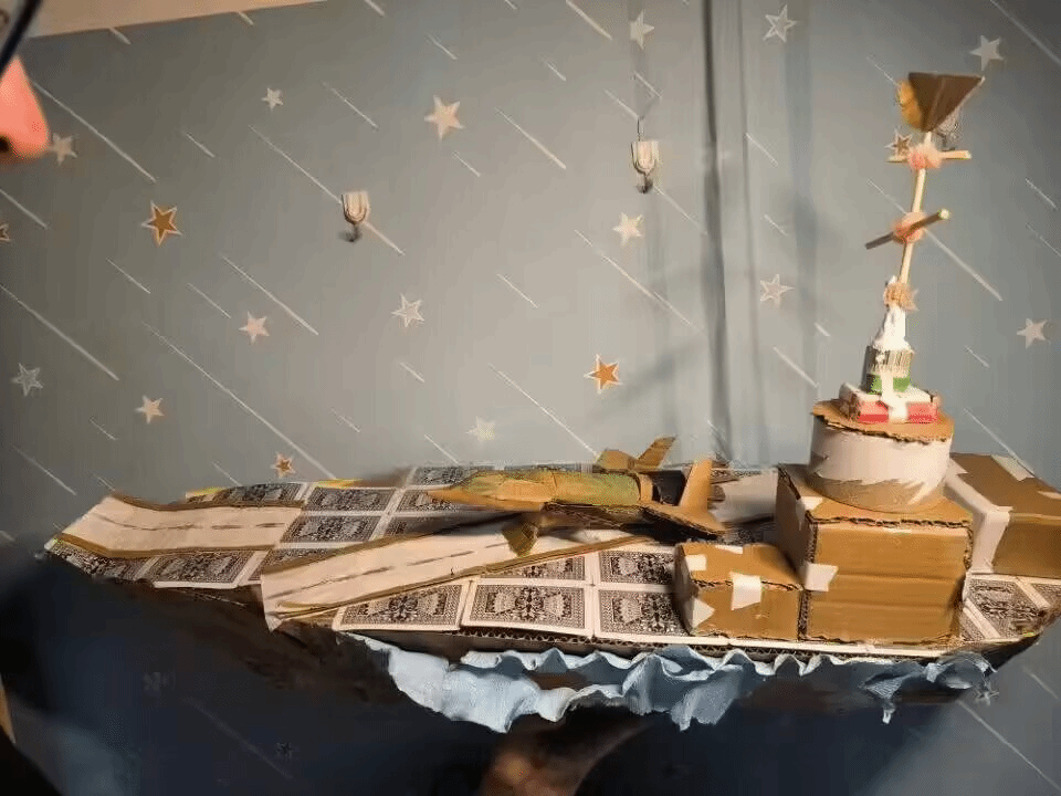 本作品是由快递纸箱、木筷、扑克牌及碎布匹制作而成的一艘航空母舰,上面搭载一架战斗机,机舰宏伟雄壮,可以想象在海上航行时那种锐不可当的气势,令人震撼不已。