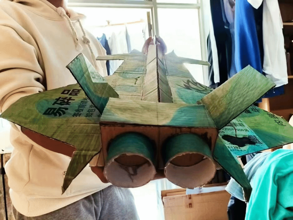 作品是用废弃纸板做成的歼二十飞机模型。机翼,机身以及垂尾和襟翼等部分设计精巧,甚至还有用细绳制作的简易起落架,仿佛一不留神它就要飞上天。勇于挑战,敢于创新,歼二(十)一出,谁与争锋?