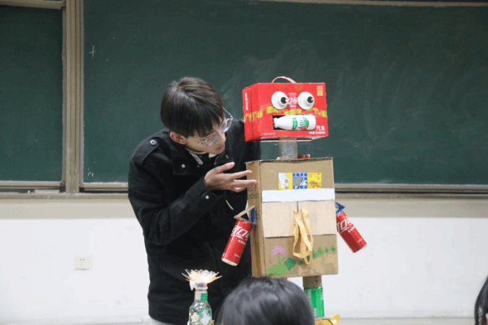 机器人利用废弃纸箱、饮料瓶手工制作而成,脸上表情颇具趣味,似在微笑有似在说话,作品给人创意与活力的感觉,也是创意与科技的结合。