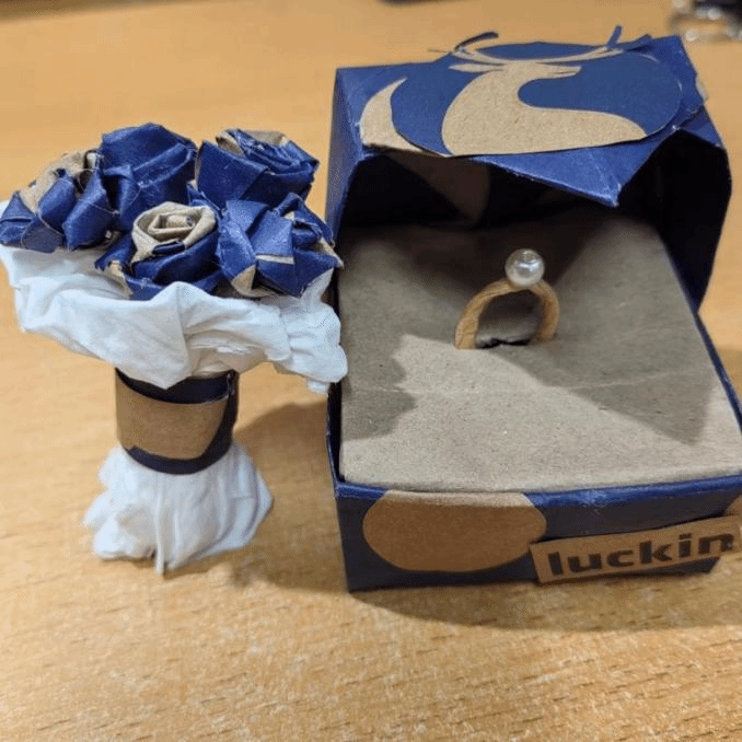 作品的主要制作材料为纸箱。DIY戒指盒和花束,满满的仪式感。花不会枯萎,爱永不凋零。浪漫值拉满。