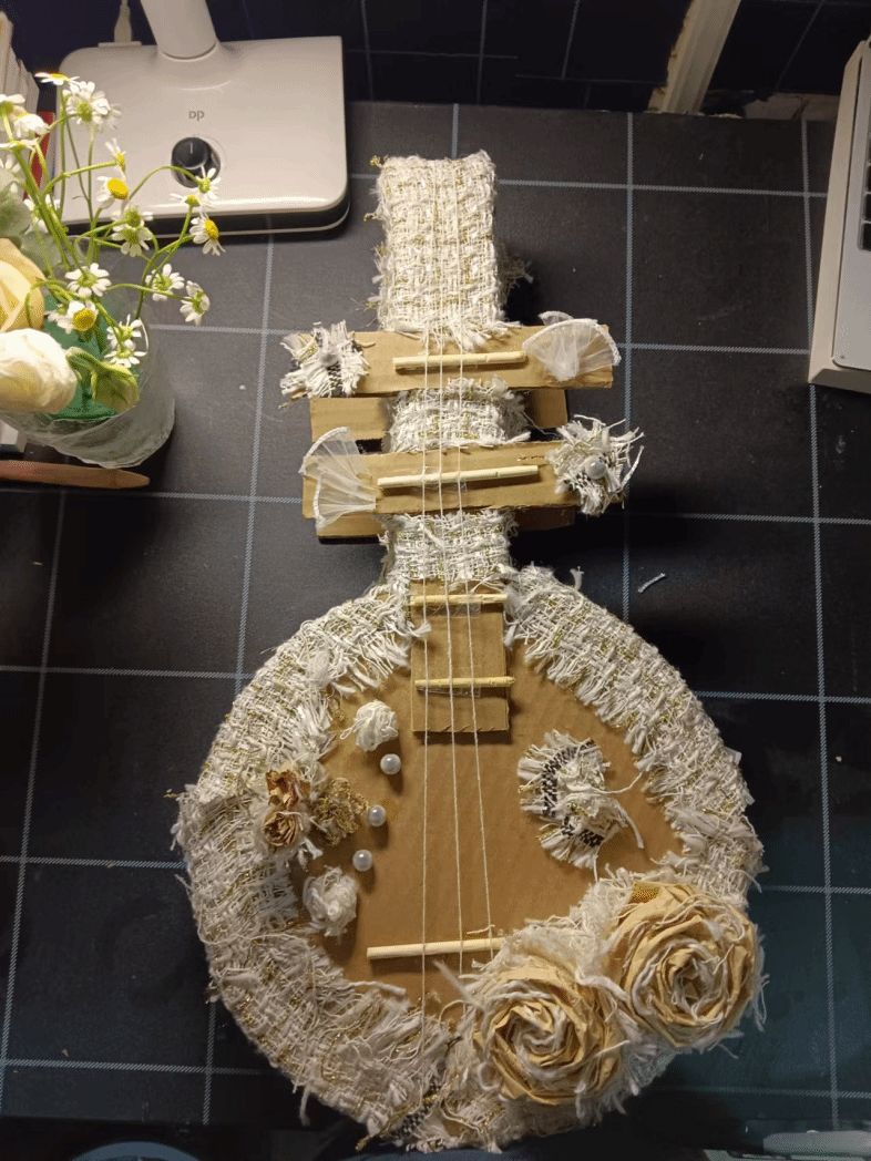 利用废旧的纸箱,胶水,胶带,剪刀,牛皮纸,尺子,筷子等等工具制做了一把精美的月琴。“利用中西方结合的样子,手工的形式把它体现出来,可以用来当成物品摆件装饰,也可以用来拍照,欣赏。通过月琴的外型来弘扬传统文化,了解民族乐器的美丽。