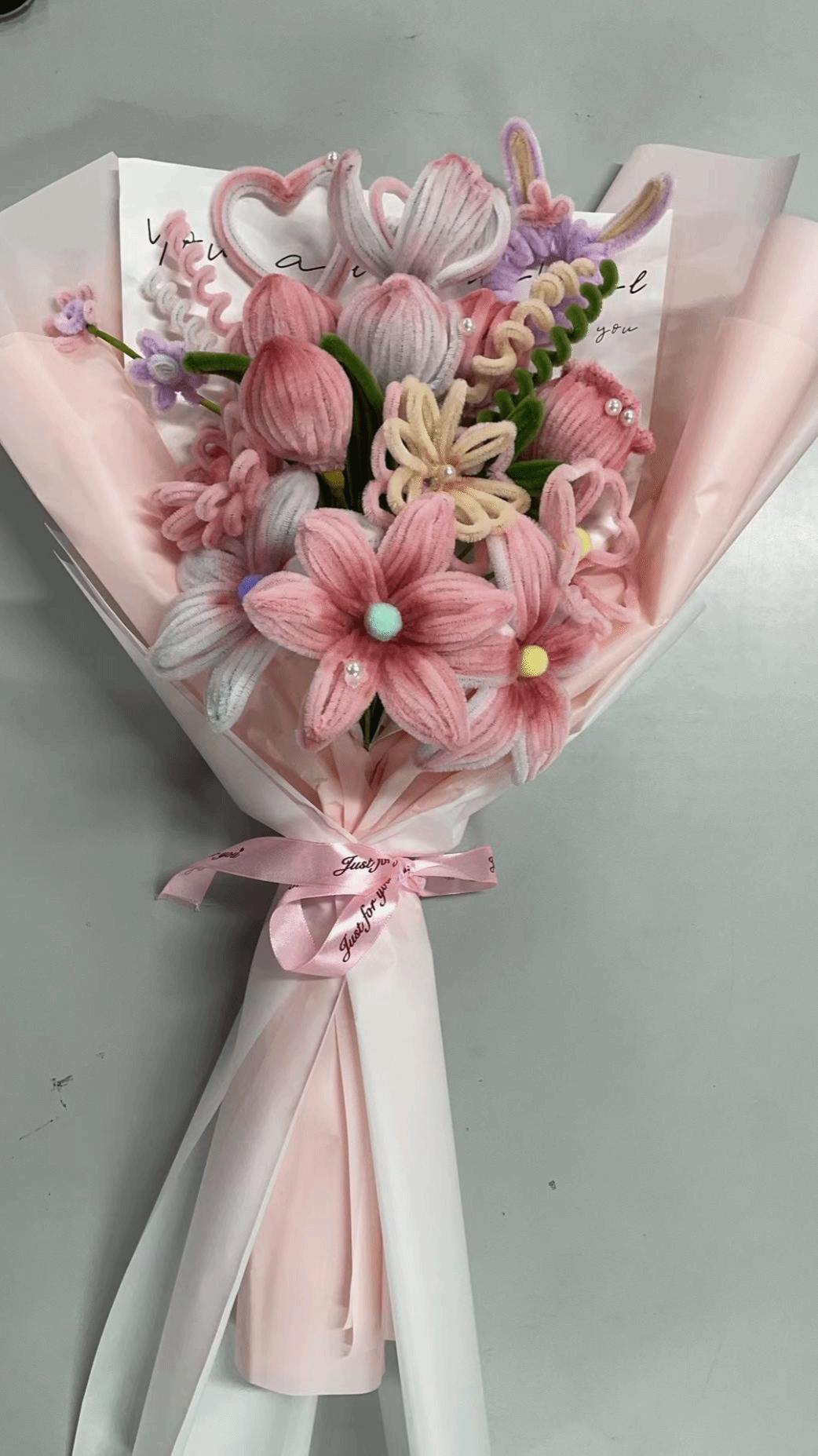 该作品主要由扭扭棒通过扭、折、绕、粘等多种技法制作而成。每一朵花都由许多个花瓣组成,每一朵花瓣弯曲缠绕在一起,并用胶带纸将花朵和枝干进行结合。通过借助春天万物复苏、春暖花开的温暖感给大家带来愉悦和幸福。