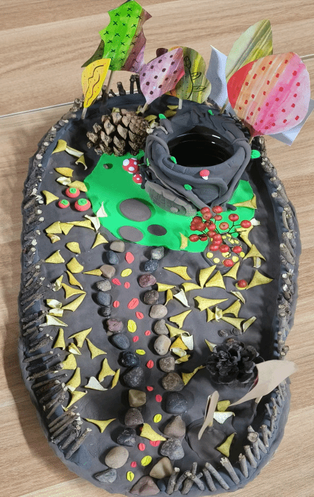 该作品由废弃的快递纸盒、矿泉水瓶、烧烤签、轻粘土制作而成,有效节约了资源的消耗,对环境保护起到了积极作用;能够帮助自己收纳部分东西,提高空间利用率,落叶、树林、松果、石井等景物分布在这座“山”中,呈现出一幅美丽的秋景图,无不展现了对大自然的喜爱。