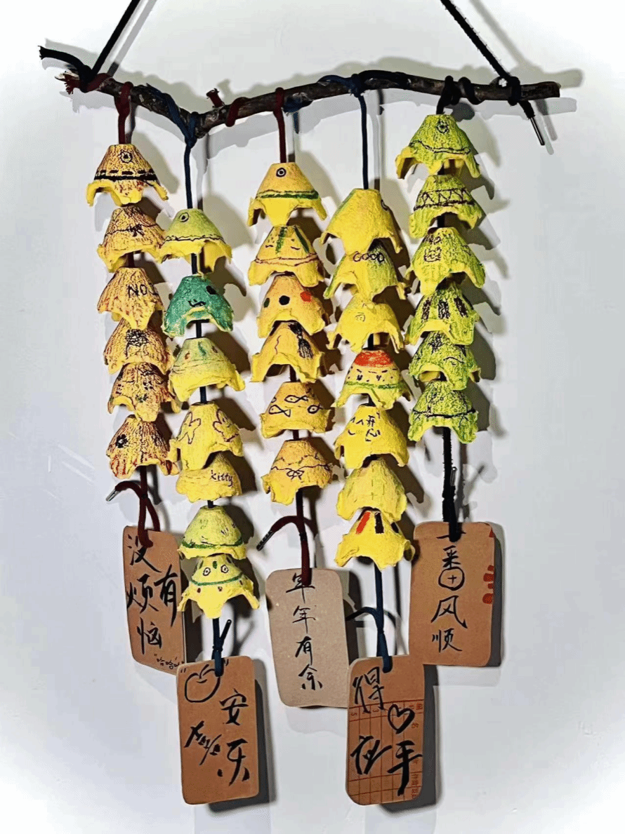 该作品是由一次性筷子,秋末的落叶,塑料瓶,纸盒,口罩制作而成,有效提高了资源的利用率,提升人们的环保意识。让我们捡个秋天,做个风铃,其实随手扔掉的垃圾也可以这么美,浪漫不是必须贵,而是要有心。