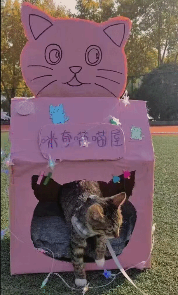 作品用收集的废弃纸箱、报纸、杂志作为猫屋外壳,又在内部添加一些保温材料,如泡沫、棉花等,以提高猫屋的舒适度。也不知是谁家小猫在体验房间,准备睡一个舒舒服服的午觉呢?