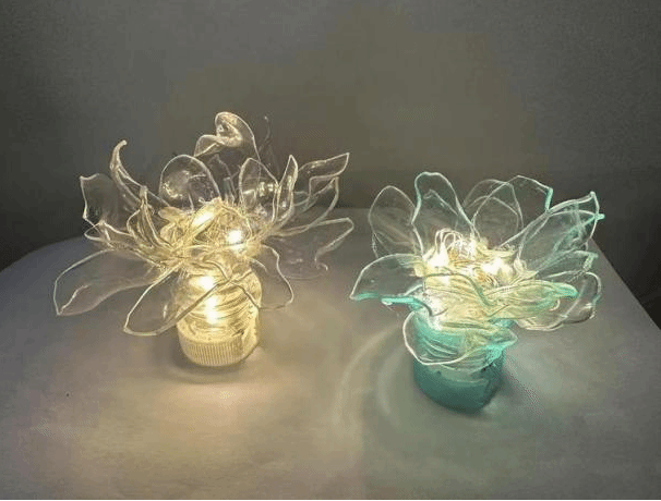 作品主要将宿舍回收的旧瓶子,裁剪为花心和花瓣两部分,并利用打火机加热以及热熔胶将各部分组装连接。这款洁白无瑕的莲花灯可以让我们享受灯光,象征着光明和希望,同时也是一件环保、美观的装饰品。