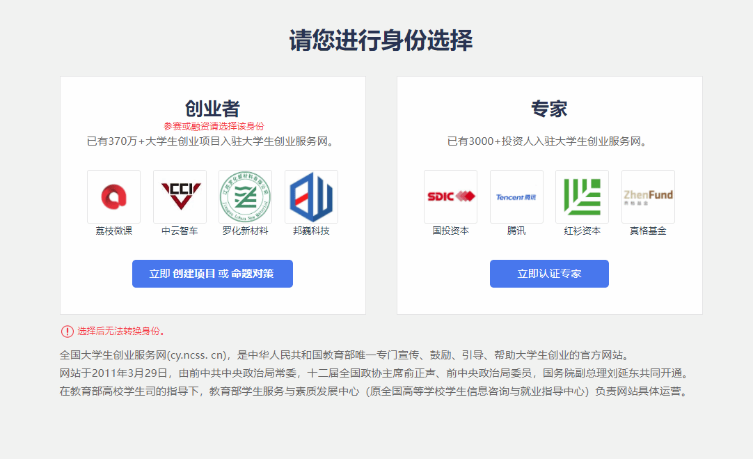 注册成功后可进行身份选择:创业者(点击“立即创建项目”,参赛请选择该身份)或专家(点击“立即认证专家”)。请参赛者务必点击“立即创建项目”成为创业者,勿选择“立即认证专家”。请注意:身份选择前请再次确认所选身份,身份选择后将无法进行身份转换。