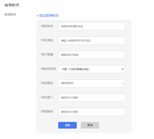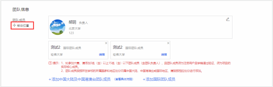 请注意:1、不要求团队一定要有指导教师,可以不填写。2、指导教师添加完毕后,可点击“移动位置”排序。