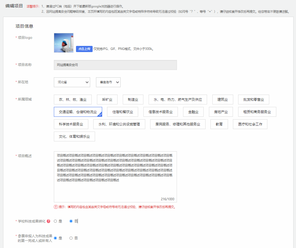 请注意:1、一个创业者账号可创建三个项目,但仅允许一个项目报名参赛(所创建项目名称不可与库内其他项目名称重复),且创建者需为项目团队负责人。在报名系统未关闭期间可自由编辑、修改项目相关信息。2、项目一旦创建完成将无法修改项目名称,如果需更改项目名称,要删除项目重新创建。(如果项目已通过审核进入校赛或者省赛,删除后项目会退回到待审核状态,请谨慎操作。删除项目前须及时和美高梅娱乐场