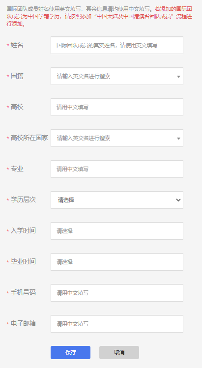 请注意:1、国际团队成员姓名使用英文填写,其余信息请均使用中文填写。2、若添加的国际团队成员为中国学籍学历,请按照添加“中国大陆及中国港澳台团队成员”流程进行添加。