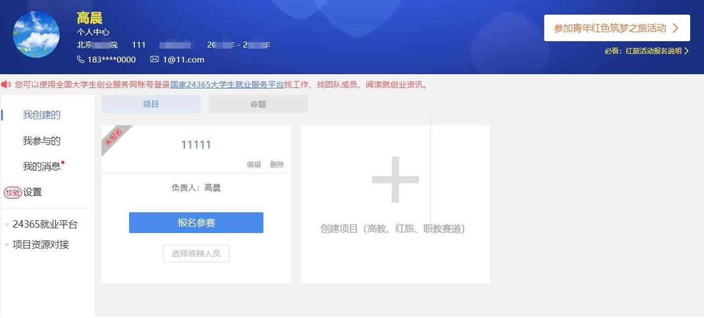 用户可以在“我创建的”—“项目”中查看已经创建的创业项目(点击“报名参赛”,填写参赛信息并确认提交,完成报名参赛),如果未创建项目则可点击“创建项目”进行创建。