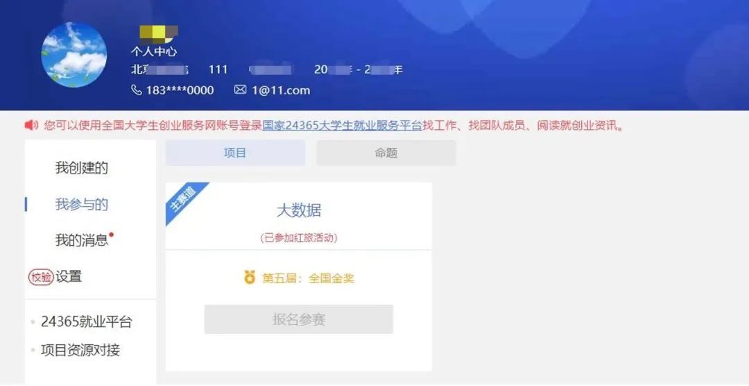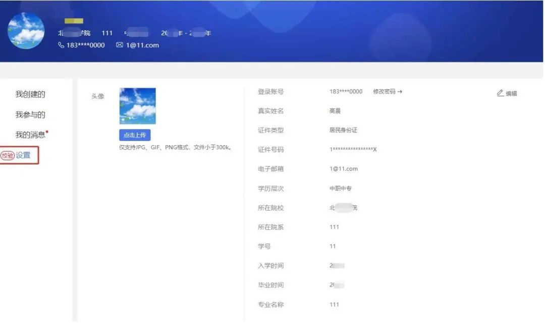 个人中心的“设置”版块可修改个人头像、密码。其他个人信息修改时需同时通过学籍学历验证方可修改。一旦项目报名参赛,个人信息不可修改,如需修改请点击“取消报名”操作或删除项目。注意:完善个人信息时若未通过学籍学历校验(个人中心左上角出现红底白字“学籍校验不通过”字样),请点击“校验必看”查看学籍校验不通过处理办法,然后点击“设置”,重新填写学籍学历信息提交校验(填写信息需与学信档案信息保持一致方可通过验证)。