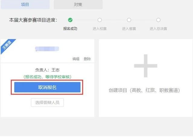 报名参赛后,如需更改项目的参赛信息(参赛赛道、参赛组别、参赛类别),请进入个人中心的“我创建的”—“项目”中点击该项目标签中的“取消报名”(如上图)后,在报名系统关闭前,重新报名参赛。请注意,已报名参赛项目可能已经通过校级、省级审核,所以请在“取消报名”前,联系所在院校及省市,以免影响项目参赛。