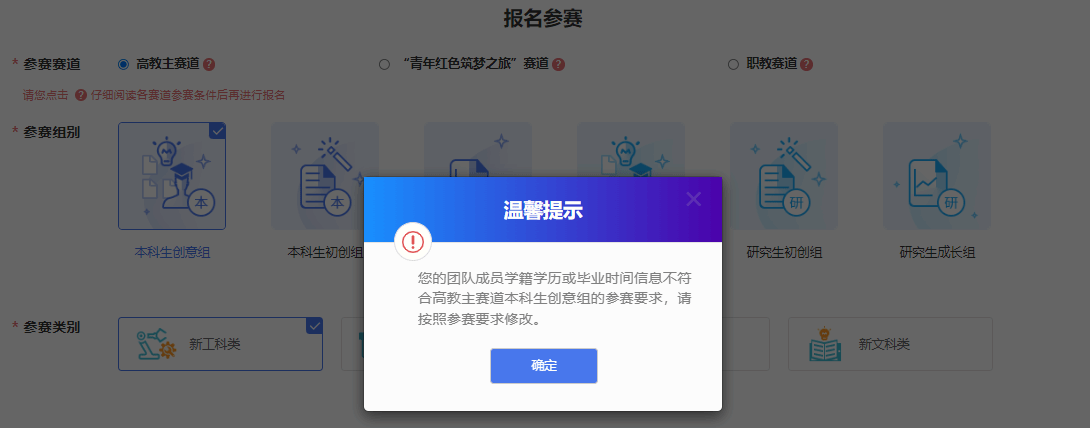 完成项目的创建后即可报名参赛,需选择参赛赛道、参赛组别及参赛类别,如下图,选择完成后点击“确认参赛”即可进入参赛的审核环节(项目报名完成后,由团队负责人所在院校进行审核)。请注意:1、填写报名参赛信息后,如该项目不符合所报赛道及组别的相应要求,则无法提交参赛,系统会对项目不符合要求的信息进行提示。请按照参赛要求重新填写或更换其他赛道、组别。2、选择“青年红色筑梦之旅”赛道的项目需已报名参加“青年红色筑梦之旅”活动。