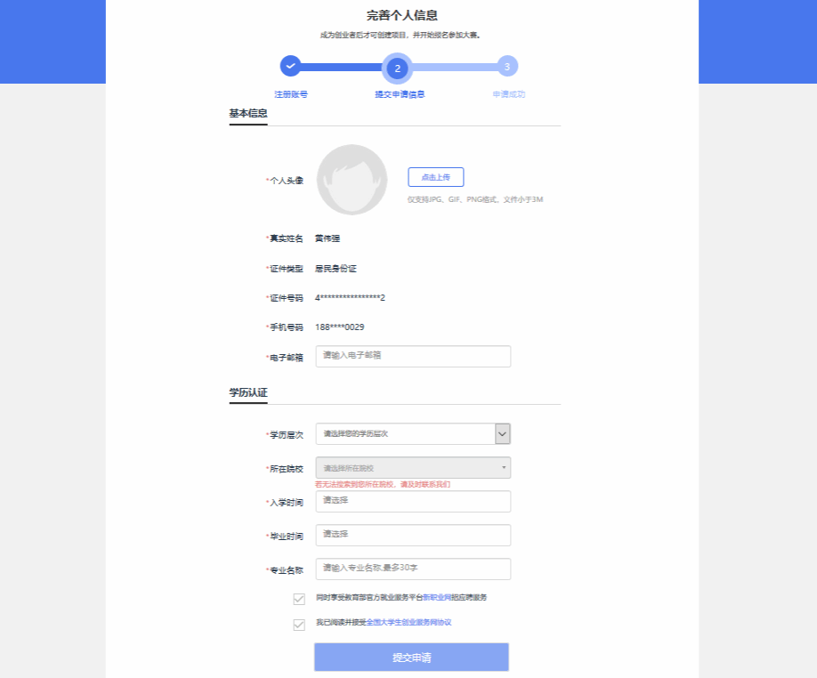 选择“创业者”身份,点击“立即创建项目”后,需完善个人信息并进行学籍学历信息验证(提交申请后,个人中心显示“学籍校验未通过”则无法进行报名参赛、报名“青年红色筑梦之旅”活动等其他操作)。填写的相关信息如上所示。若无法搜索到您所在院校,请联系所在院校负责大赛的老师,由所在院校联系省级负责人,并由省级负责人统一联系大赛组委会,由大赛组委会统一处理。
