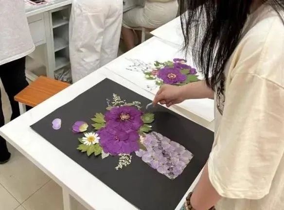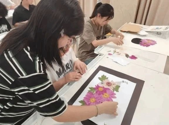 牡丹压花艺术是颇具洛阳地域特色的传统技艺,吕老师将牡丹压制成干花再创作,结合多样的绘画形式与文化内涵,将非遗压花制作技艺与牡丹文化结合,不断创新牡丹压花艺术品。实践团成员在吕俊楠老师的指导下学习如何制作压花。