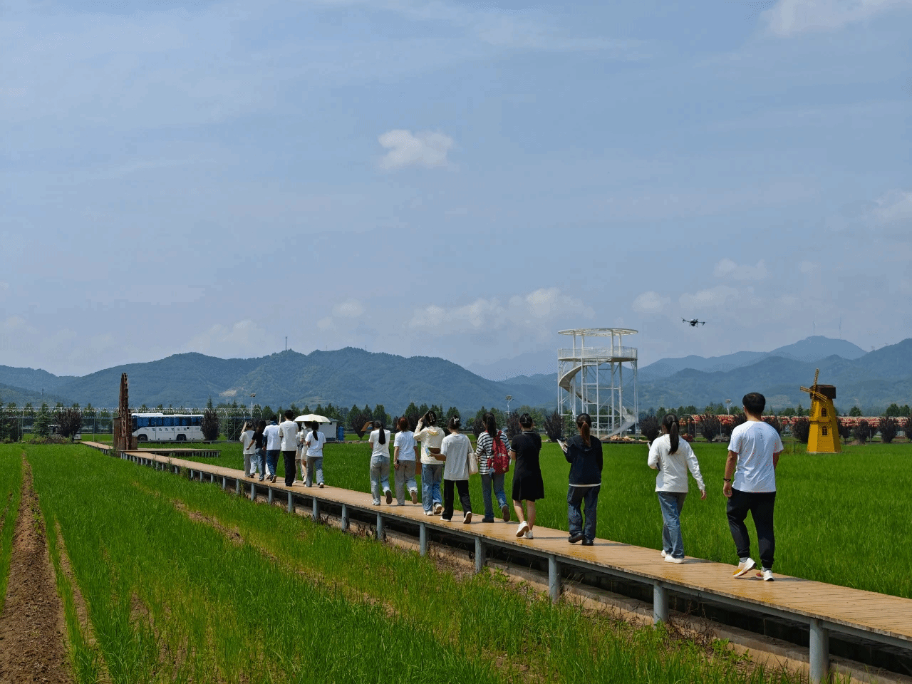 随后,实践团队前往三屯镇东保村稻田小镇——“农业+文旅”生态循环农业综合体,实地观察了村集体农业发展现状,了解了稻田小镇文旅项目运营模式。团队成员参观了稻田小镇内的稻田小火车、升空热气球、种植稻田画、观光塔等特色项目。在调研过程中,三屯镇的芦主任为实践团队详细地介绍了稻田小镇的“产业+文旅”模式以及乡村运营平台,还介绍了三屯镇的“稻田名片”及稻田音乐节等特色活动,向成员们展示了一幅全村同心的画卷。