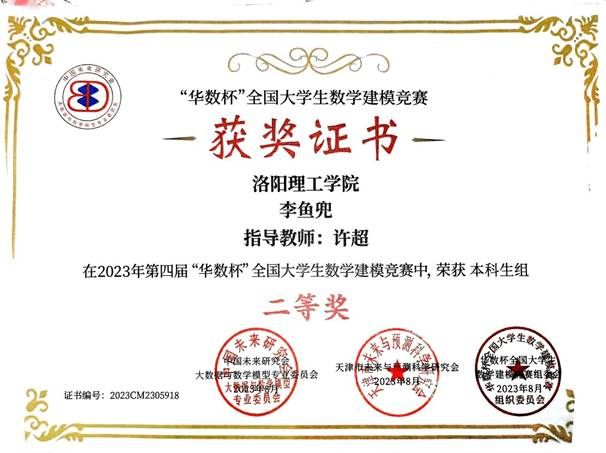 在专业学习与科研创新中,李鱼兜始终保持着卓越的进取姿态。他连续两年稳居专业综合成绩第一,先后斩获全国大学生数学建模竞赛国家二等奖、“华数杯”全国大学生数学竞赛本科组二等奖、中国国际大学生创新大赛(原“互联网+”大学生创新创业大赛)省级二等奖等多项学科竞赛荣誉。作为学习委员和辅导员助理,他积极搭建师生沟通桥梁,组织学习经验分享活动,带领班级形成浓厚学风,成为同学们心中的“学业领航者”。