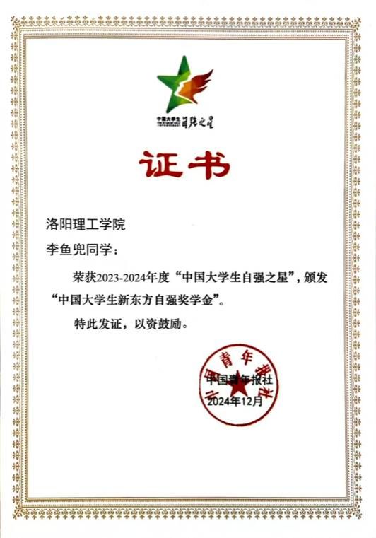 智能科学与技术专业2021级学生李鱼兜同学荣获“中国大学生自强之星”称号,并获颁“中国大学生新东方自强奖学金”。