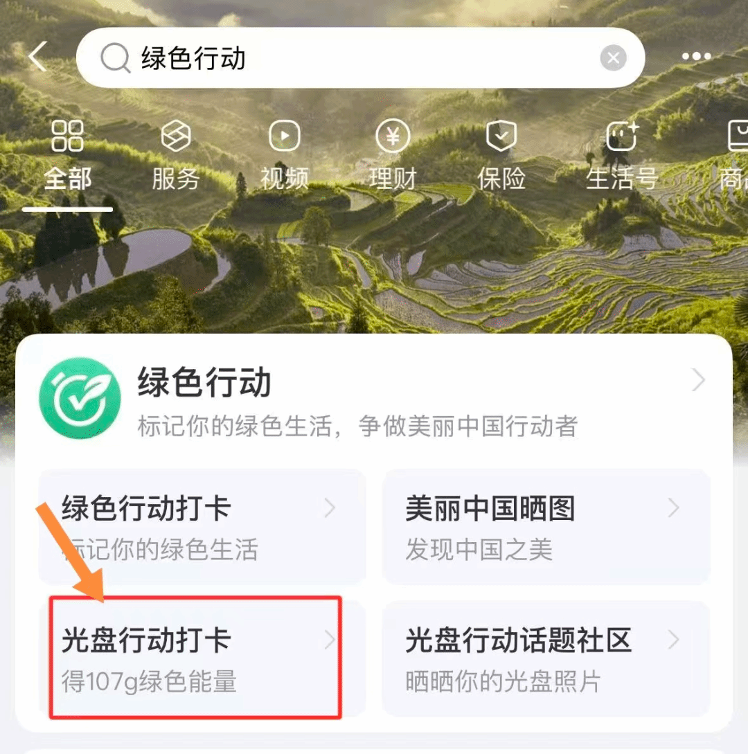 支付宝搜索绿色行动小程序 参与光盘打卡