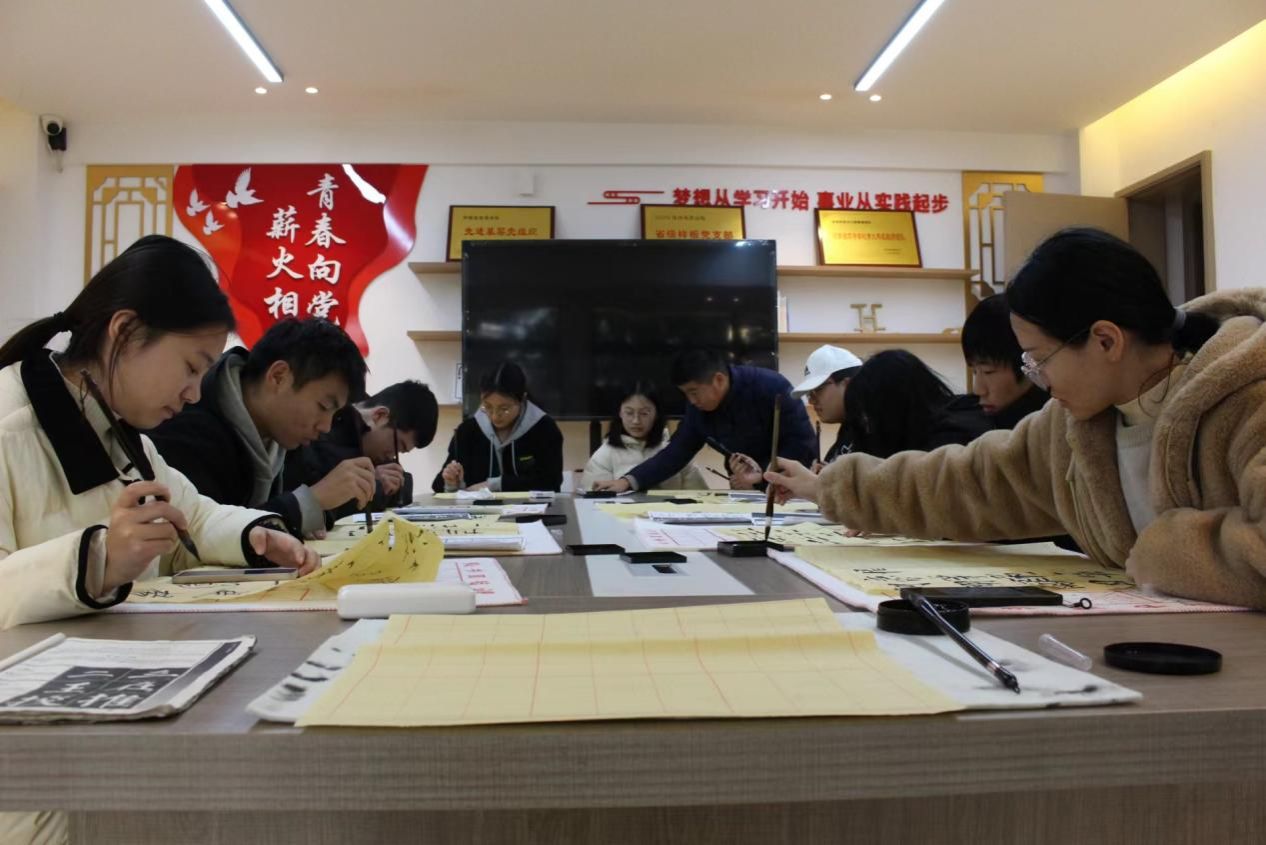 执笔挥毫,墨入白纸,书法渐成,真可称得一句“翩若惊鸿,婉若游龙”。基础的执笔方法、发力在导师的辅导下也显得简单易懂;练习笔画、学习悬针竖式写法更加激起了同学们对书法的热情。一股浓浓的墨香把同学们包裹在了里面,呼吸间满是书香。