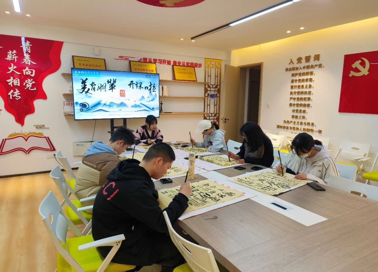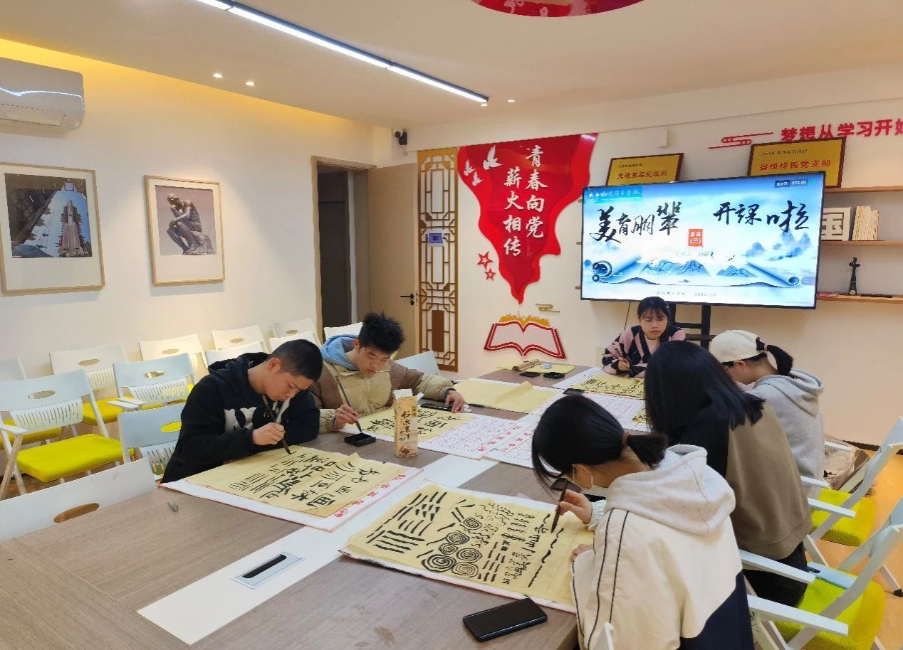 在书法授课中,每一位同学都认真听讲,手执毛笔,挺拔身姿,在宣纸上用心练习着一横一竖,氛围安静,只剩下轻浅的呼吸声,以及时不时的布料摩擦声,偶尔也会传出与朋辈导师的几句交谈声,整个房间都洋溢着同学们对书法的热爱的气息。