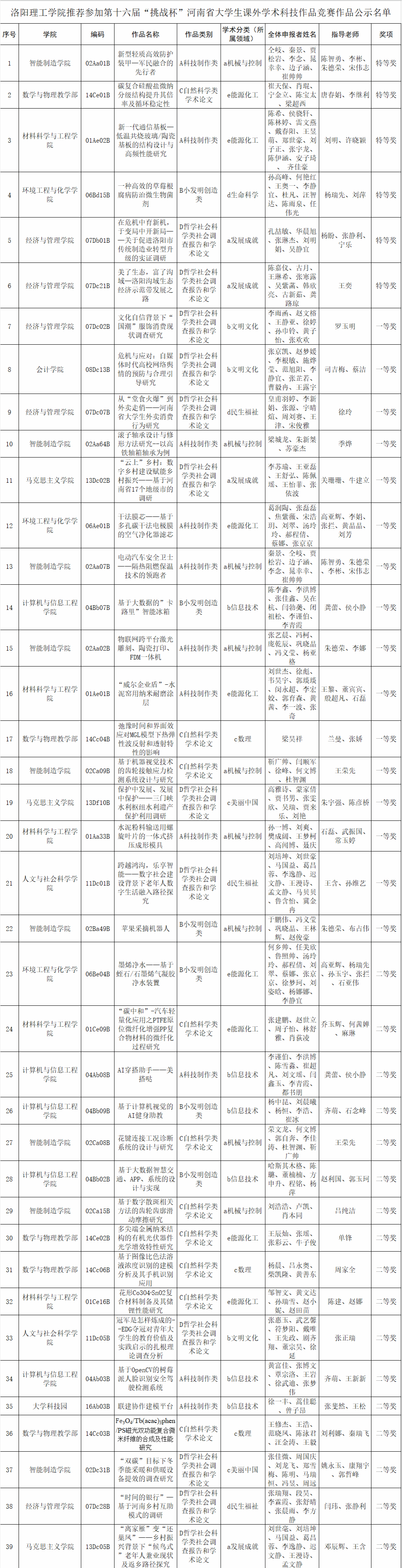 根据《关于组织开展第十六届“挑战杯”河南省大学生课外学术科技作品竞赛的通知》精神和比赛要求,经专家评审推荐,美高梅娱乐场 共产生39件作品推荐参加第十六届“挑战杯”河南省大学生课外学术科技作品竞赛,现予以公示。