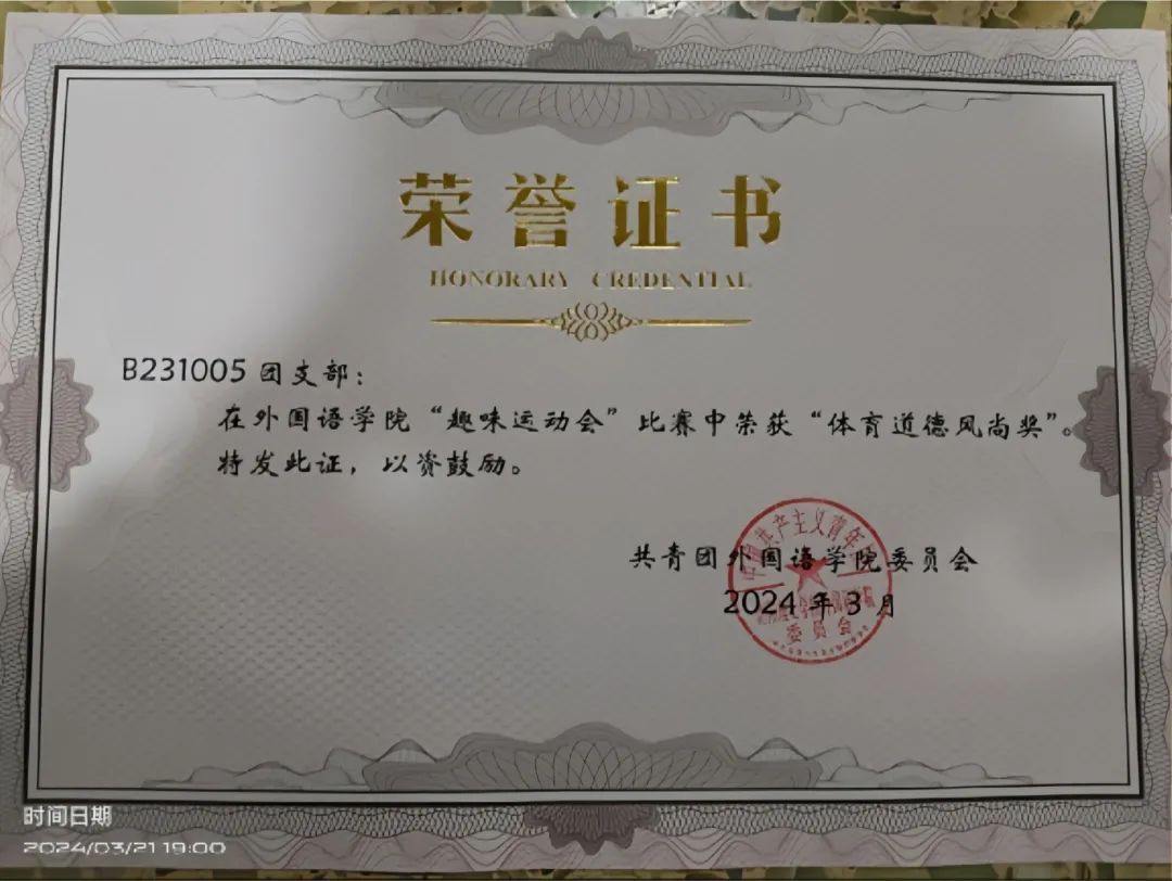 “体育道德风尚奖”、团支部答辩第一、二等荣誉嘉奖。