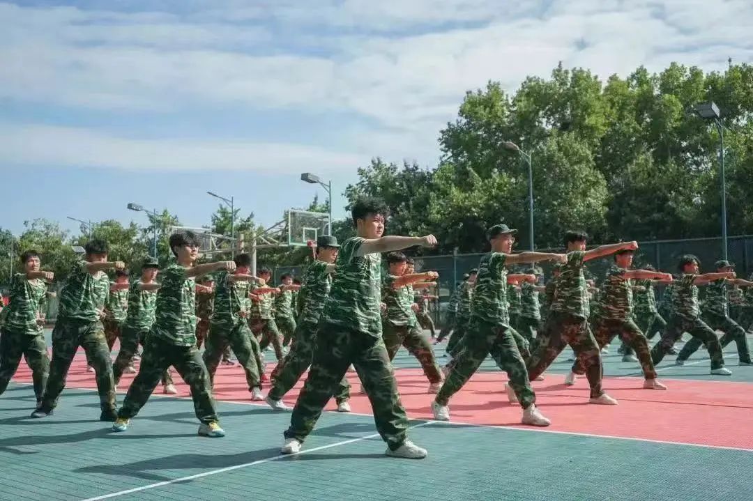 在王城校区开展军训活动。在烈日炎炎的操场上,学生们身着统一的迷彩服,站立成排,军姿挺拔而在军体拳方阵中,学生们更是精神饱满,眼神中闪烁着斗志与决心,随着指挥官的口令爆发出震耳欲聋的喊杀声。