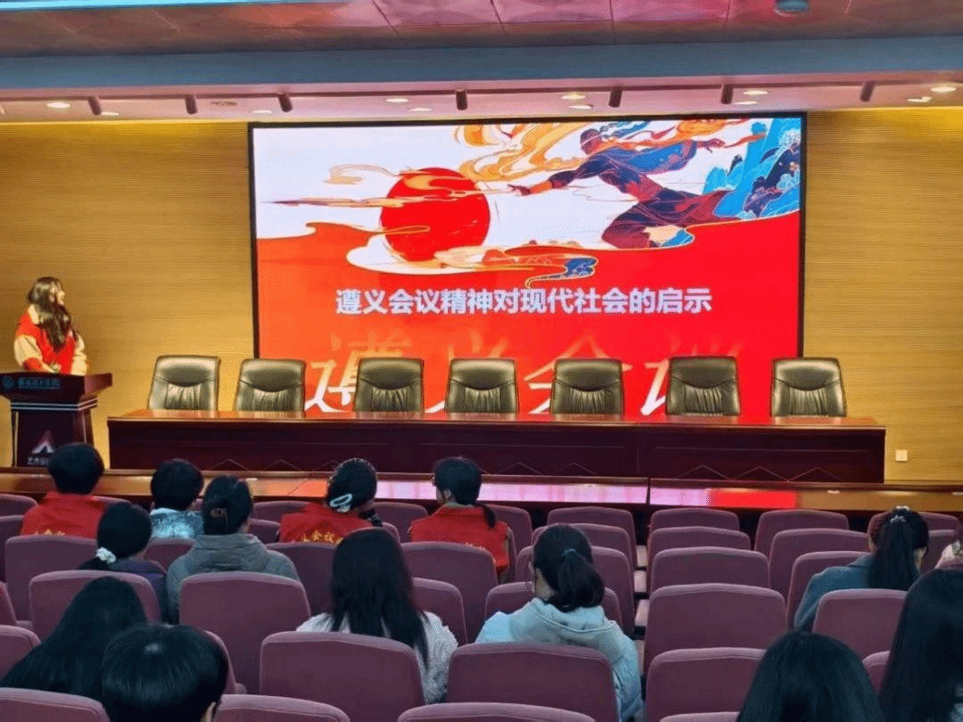 “遵梦红,忆峥嵘”遵义会议宣讲团在九都校区学术报告厅举行遵义会议精神宣讲会。宣讲团成员以详实史料讲述会议历史背景,重现现场讨论交锋;互动环节中,同学们积极提问交流。此次宣讲让学生深刻理解党的历史,为新时代征程注入精神动力,激励学生不忘初心,书写青春华章。