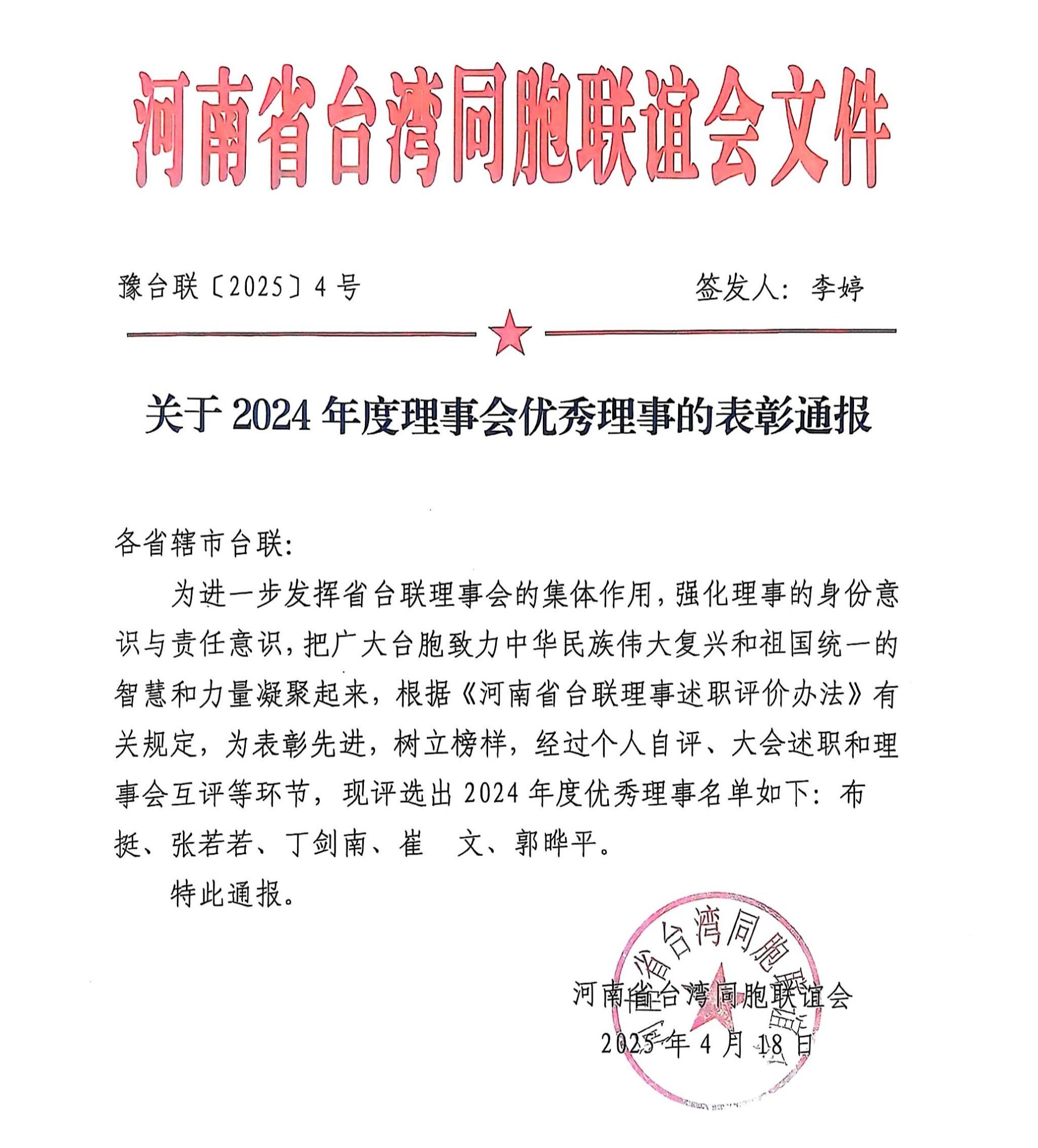 近日,省台联发布《关于2024年度理事会优秀理事的表彰通报》,美高梅娱乐场 电子信息美高梅娱乐场 教师布挺获评优秀理事。