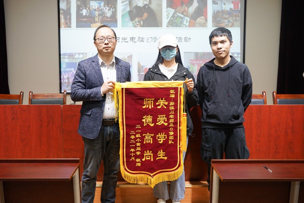 近两年,为了让不同专业的学生对各自专业所需电脑配置有认知,义务开展线上讲座,给学生讲解计算机配置知识要点,带领志愿者团队免费为学生的新电脑安装软件。每年服务近3000名新生,受到新生和家长好评。有一次,有个新生打算购买电脑,听了郭老师的讲解,才发现自己被商家欺骗,在郭老师的帮助下,她挽回了几千元的损失。学生万分感谢,给他和团队送来感谢锦旗。
