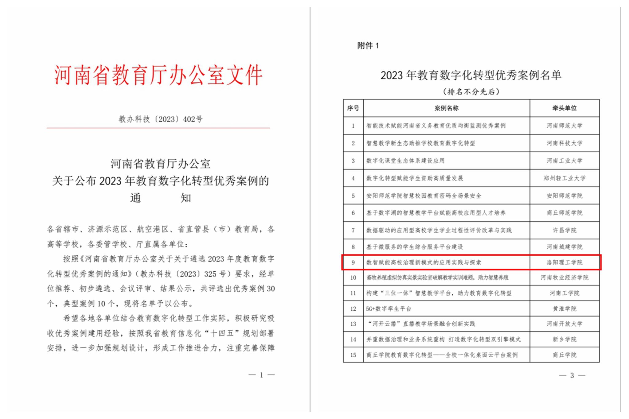 申报的项目《数智赋能高校治理新模式的应用实践与探索》成功获评河南省教育数字化转型优秀案例。