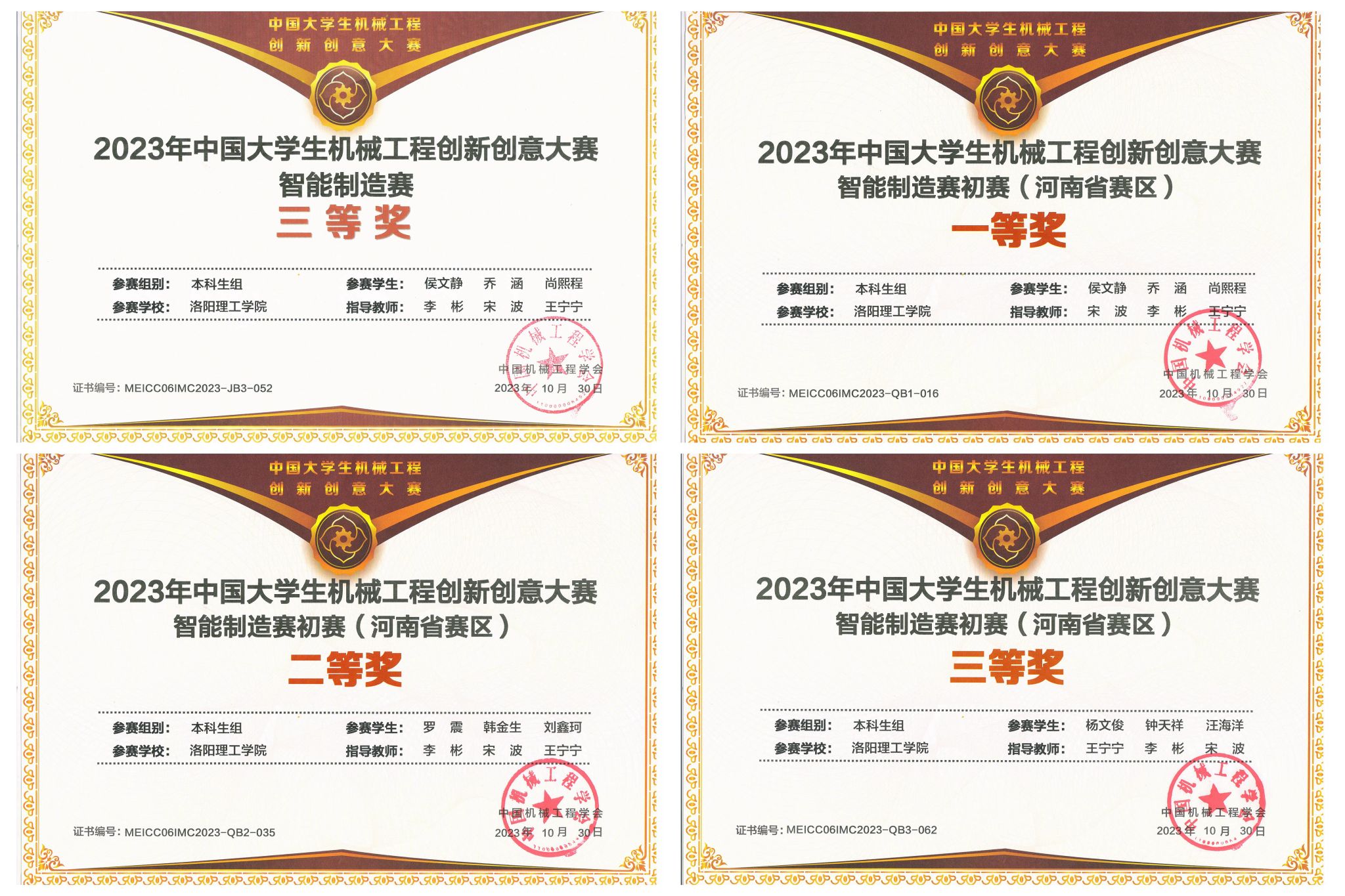 团队(指导教师:李彬 宋波 王宁宁,参赛学生:侯文静 乔涵 尚熙程)在2023年中国大学生机械工程创新创意大赛智能制造赛(本科生组)中荣获全国总决赛三等奖。